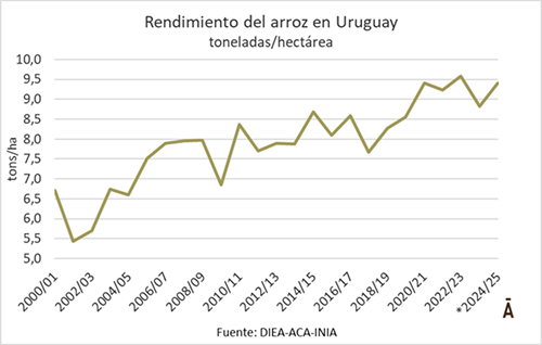 En la campaña 2024/25 Uruguay creció en más de 30 mil hectáreas su superficie arrocera (182.874 hectáreas), consolidó el tercer mejor rendimiento promedio de la historia (kg/ha 9.404), y configuró así la campaña más voluminosa de todos los tiempos con algo más de 1,7 millones de toneladas. Todo esto fue determinado en el XXI Taller de Evaluación de la Zafra de arroz en INIA Treinta y Tres, donde se destacó la integración del rubro, con la participación de productores, industriales, autoridades del Ministerio de Ganadería, empresarios vinculados al rubro y por supuesto, el equipo investigador de la Estación Experimental INIA Treinta y Tres, consignó Rurales El País.