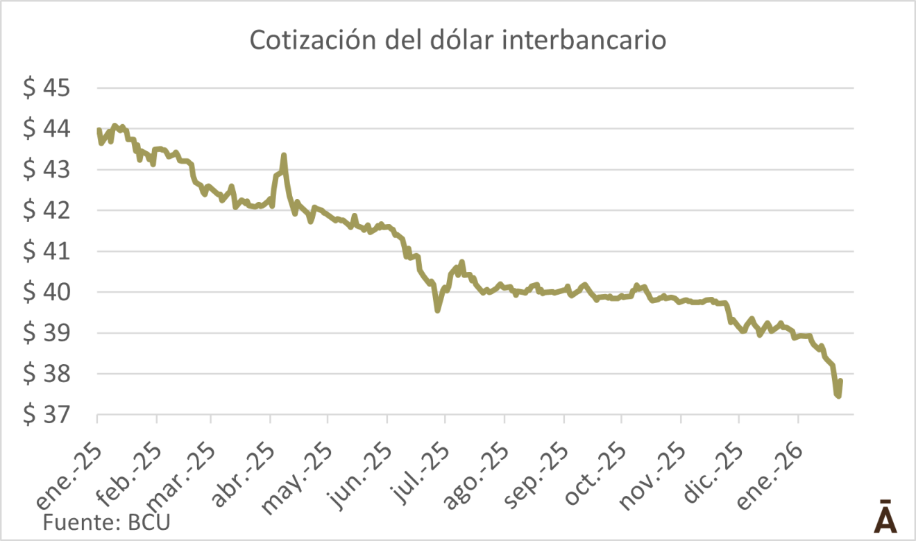 En el promedio del mercado mayorista, el dólar subió 1% este lunes versus el viernes y quedó en $ 37,83. De todas formas, en el acumulado de enero la moneda estadounidense perdió 3% frente al peso uruguayo y 12% en el último año móvil.