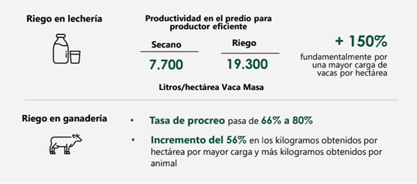Actualmente se riegan menos de 100 mil hectáreas en Uruguay en actividades que utilizan riego suplementario. El informe muestra que los incrementos de productividad son contundentes: en promedio para las últimas cosechas, el riego eleva los rendimientos de maíz en 73% y 38% para la soja; puede lograr un incremento de la producción lechera de hasta 150% por hectárea y un aumento significativo en la producción de carne.