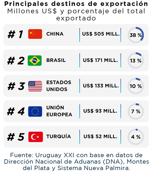 China fue el principal destino de exportación en junio de 2025, con ventas por US$ 505 millones y una caída interanual de 4%. La baja respondió principalmente a la caída interanual en las colocaciones de soja, parcialmente compensada por mayores envíos de carne bovina.