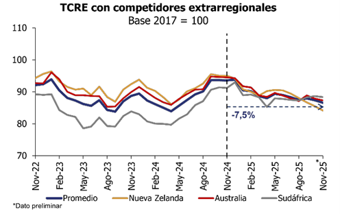 Por su parte, el TCRE bilateral con respecto a países competidores se habría apreciado 1,1% en el promedio del trimestre móvil a noviembre (preliminar) en comparación con el trimestre inmediato anterior. En términos interanuales se observa una apreciación de 7,5% a noviembre, impulsada principalmente por la evolución de los precios relativos con Nueva Zelanda y Australia.