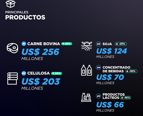En mayo de 2025, las solicitudes de exportación, incluidas las zonas francas, alcanzaron US$ 1.169 millones y marcaron un aumento interanual de 1%. Las exportaciones de este mes estuvieron impulsadas principalmente por las ventas de carne bovina, celulosa y vehículos, según el informe de Uruguay XXI. En el acumulado enero–mayo de 2025, las exportaciones de bienes, incluidas las zonas francas, totalizaron US$ 5.119 millones, lo que implica una suba interanual de 4%.