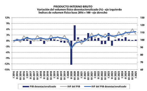 En el primer trimestre de 2025, el Producto Interno Bruto (PIB) registró un incremento de 3,4% con relación al primer trimestre de 2024. En términos desestacionalizados la actividad económica creció 0,5% respecto al cuarto trimestre de 2024, según el informe de Cuentas Nacional que divulgó ayer el Banco Central del Uruguay (BCU).