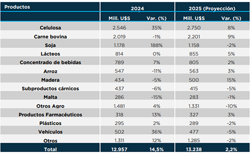 Las exportaciones uruguayas de bienes crecieron 14% en 2024, impulsadas por la recuperación del sector agropecuario tras la sequía de 2023 y el primer año de operativa plena de UPM Paso de los Toros. La expansión se concentró en el segundo y tercer trimestre, cuando la soja tuvo un peso determinante en las ventas externas, efecto que se moderó en los últimos meses de 2024. “Para 2025, en un contexto de estabilidad climática y demanda externa estable, se prevé una consolidación de las exportaciones uruguayas de bienes, con un crecimiento en valor del orden de 2%, aproximadamente US$ 13.200 millones”, según Uruguay XXI.