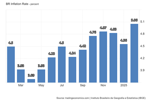 La inflación en Brasil subió en febrero pasado hasta el 5,06 % interanual, medio punto más que en enero, con lo que alcanzó su nivel más alto desde septiembre de 2023, informó este miércoles el gobierno. El índice nacional de precios al consumidor se disparó en el segundo mes del año hasta el 1,31 %, frente al 0,16 % que había registrado en enero, según el Instituto Brasileño de Geografía y Estadística (IBGE).
