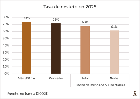 El dato de la tasa de destete en 2025, basado en la información del rodeo vacuno dado a conocer por el Ministerio de Ganadería (MGAP), da cuenta de un resultado récord de 71,3%. Sin embargo, este gran promedio sigue escondiendo deficiencias en los predios de menor escala, especialmente en el norte del país.