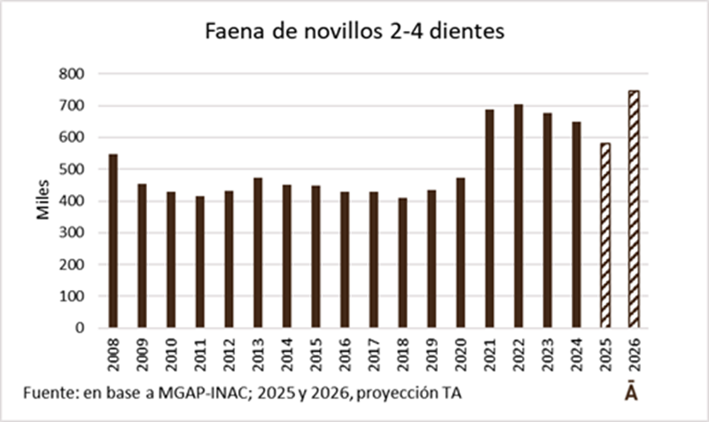 Todo indica que el mercado internacional seguirá firme en 2026 y eso sostendrá los valores de la hacienda a faena. Pero el sobreprecio adicional determinado por la relativa escasez de oferta interna no pesará como lo hizo este año. Es factible que esto lleve a la relación entre el precio de la hacienda y el de la exportación de carne a niveles más cercanos a los históricos que, en el caso de los novillos, es 93% (7% menor el kilo de novillo que el de la carne exportada). Este año, en especial en el segundo semestre, se ubicó significativamente por encima de ese valor.