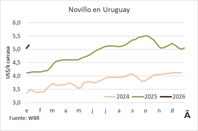 Los valores que se manejan en esta primera semana hábil del año se ubican en US$ 5,10–5,15 para el novillo (lotes especiales pueden llegar a US$ 5,20), mientras que la vaca especial se mueve en US$ 4,70-4,80. En el caso de las vaquillonas, las referencias rondan los US$ 5,00.