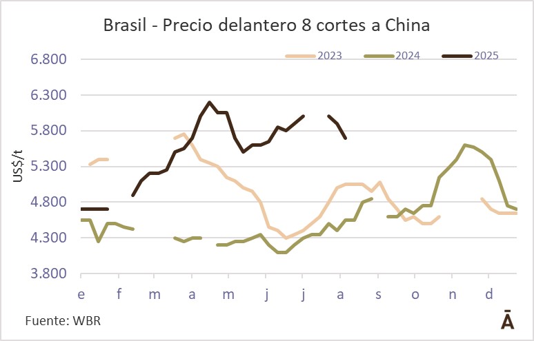 Un trader brasileño dijo a World Beef Report (WBR) que son varias las plantas que están “vendidas para adelante con China”, por lo que no están realizando nuevas ofertas por el momento. La semana pasada, previo a la publicación de la Casa Blanca sobre el aumento de la tasa a los productos brasileños, hubo intensos rumores en cuanto a cuantiosas ventas a empresas estatales de China por parte de JBS, aunque ninguna de las fuentes consultadas por WBR lo confirmó (más allá de que estaban al tanto del rumor).
