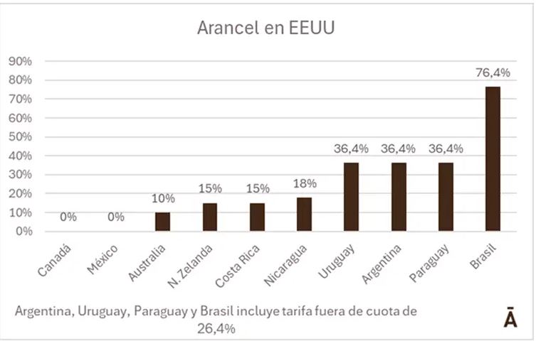 En base a los anuncios realizados por Trump para los aranceles de los distintos proveedores de carne vacuna, desde fuera de América del Norte quien corre con ventaja por tener la tasa menor es Australia, con 10% y una cuota de más de 400 mil toneladas, en tanto que Brasil queda virtualmente fuera del mercado con una tasa de 76,4% para el producto fuera de cuota. Brasil completó la cuota 2025 en las tres primeras semanas del año.