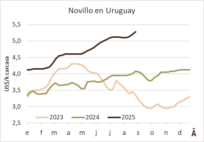 “Los compradores llaman, incluso en el feriado de ayer (por el lunes), pero es muy difícil conseguir oferta”, comentó un intermediario en la tarde de ayer. Los novillos especiales de exportación se pagan hasta US$ 5,30 el kilo carcasa (hubo negocios confirmados a ese valor), pero la escasez de operaciones dificulta establecer valores de referencia. La base para los buenos novillos es de unos US$ 5,20. Las vacas pesadas llegaron a los US$ 5,00 el kilo, con un piso de US$ 4,90 para las gordas más livianas, y las vaquillonas llegan a US$ 5,10 o algún centavo más.