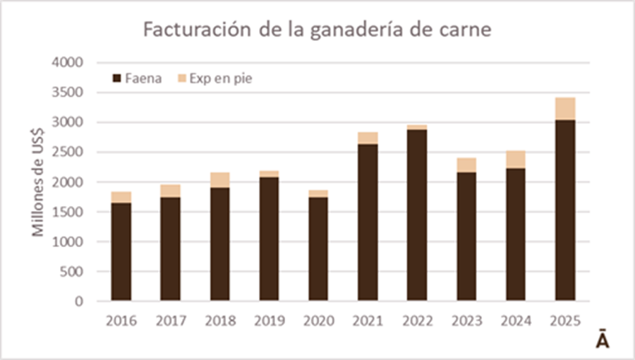 Al sumar ambas salidas, la ganadería de carne facturó este año más de US$ 3.400 millones, 35% más que en 2024 y lejos por encima del récord de 2022, cuando había quedado algo por debajo de los US$ 3.000 millones.
