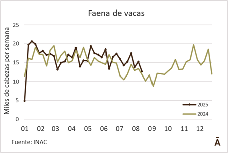 La faena de vacunos bajó en algo más de 2 mil cabezas como directa consecuencia de una menor actividad con vacas. INAC informó que en la semana al 16 de agosto se procesaron 45.989 vacunos, 2.130 menos (-4%) que en la anterior y 3% inferior al mismo período del año pasado.