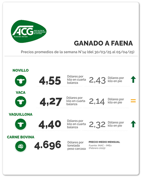 “Con buen nivel de faena y de operaciones, mercado equilibrado”, dijo la ACG en su reunión de precios de este lunes. Los intermediarios fijaron en su planilla una cotización promedio de US$ 4,55 por kg carcasa (+1 cent) para los novillos durante la semana cerrada al 5 de abril, pero dejaron sin cambios la cotización de la vaca gorda en US$ 4,27 por kg a la carne. La vaquillona, por su lado, ganó 2 cents y quedó en US$ 4,40 por kg carcasa.