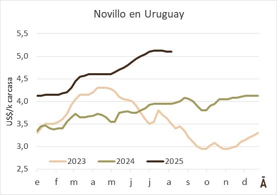 Las referencias de precios se mantienen en los mismos niveles de la semana pasada, con la mayoría de los negocios por novillos entre US$ 5,00 y US$ 5,10 el kilo carcasa, hasta US$ 5,15 por lotes especiales de carcasas pesadas, cotización que se sigue pagando en alguna planta del sur. Las vacas cotizan entre US$ 4,80 y US$ 4,85, con posibilidades de alcanzar US$ 4,90 si las carcasas son de más de 240 kilos. Hay más interés por vaquillonas, seguramente vinculado al comienzo de mes. Se hacen negocios hasta US$ 5,05 por animales de esta categoría, siempre que sean completos.
