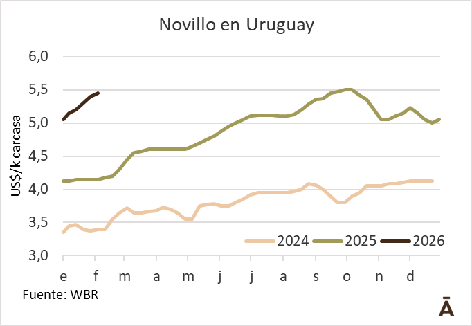 Aunque las fuentes consultadas señalaron que no se puede todavía decir que los US$ 5,50 sean una referencia “sana” del mercado, es creciente el número de negocios a este valor. La escasez de novillos es notoria, lo que lleva a la demanda a competir arduamente por animales de esta categoría.