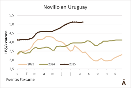 Algunas plantas que no ofrecían más de US$ 4,95-5,00 por novillos bien terminados hoy se movieron a US$ 5,05, en tanto que otras que se esforzaban por no pasar los US$ 5,10 ahora pagan hasta US$ 5,15 o algún centavo adicional. Para las vacas se pagan nuevamente US$ 4,90 si son animales pesados, o algún centavo más. El abasto está muy necesitado de vaquillonas, con precios que van de US$ 5,00 a US$ 5,05.