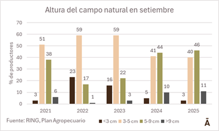 Los datos de la encuesta RING del Plan Agropecuaria (IPA) de setiembre y principios de octubre dan cuenta de que la altura del campo natural es la más alta de los últimos cinco años. Un 57% de los productores afirmó tener una altura del campo natural mayos a 5 cm, por encima del ya buen resultado de 54% del mismo momento del año pasado.
