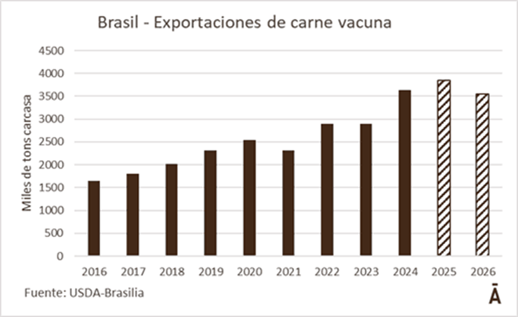 La reversión del ciclo ganadero durante el segundo semestre de 2025 disminuirá la disponibilidad de carne vacuna el año que viene en Brasil, determinando una caída de las exportaciones que la oficina del USDA en Brasilia estima en 300 mil toneladas carcasa. Del volumen récord exportado en 2025, de 3,85 millones de toneladas, pasaría a 3,55 millones, un descenso de 8% anual.