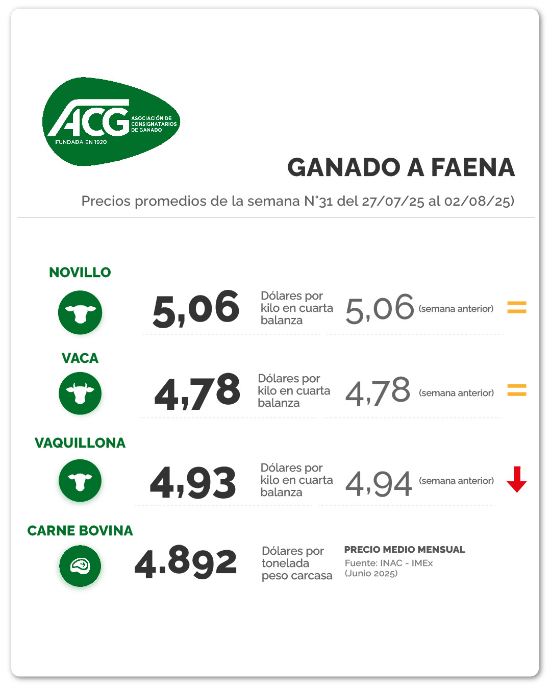 “Con leve ajuste de faena, mercado firme y equilibrado”, dijo la ACG en su comentario de este lunes por la noche. La plantilla de precios de los intermediarios dejó sin cambios la referencia del novillo en US$ 5,06 por kg a la carne y en US$ 4,78 para la vaca, al tiempo que redujo en 1 cent el valor de la vaquillona a US$ 4,93 en la semana cerrada al 2 de agosto.