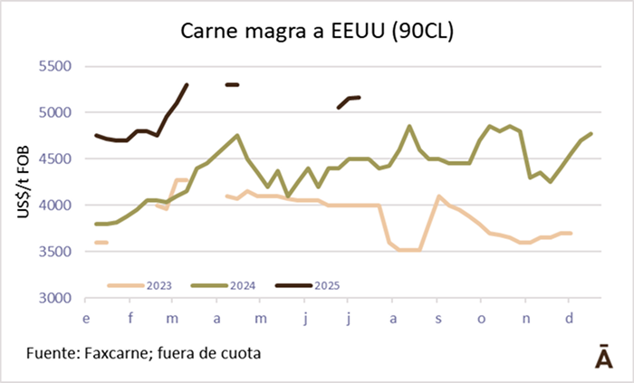 Las exportaciones de carne y subproductos vacunos de Estados Unidos totalizaron 97.266 toneladas en mayo, una caída del 12% interanual y el volumen más bajo en casi cinco años. En términos de valor, se registraron US$ 798,7 millones, un descenso de 11,5% y el nivel más bajo en 18 meses. En el caso de la carne, el volumen embarcado fue de 76.967 toneladas por US$ 716 millones. Entre enero y mayo, las exportaciones acumularon 508.293 toneladas, un 5% menos que en igual período de 2024, con un valor total de US$ 4.150 millones (-3%).