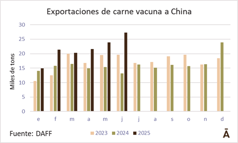 La faena de vacunos en junio creció por sexto mes consecutivo en la comparación anual, acumulando 1,22 millones de cabezas en el primer semestre del año, unas 64 mil más (+5,5%) que en el mismo período de 2024. Fue la tercera máxima faena de la historia para el primer semestre del año, solo detrás del récord de 2022 y de 2021.