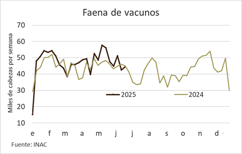 La faena de vacunos mostró un moderado crecimiento. En la semana al 21 de junio INAC informó que se procesaron 44.471 vacunos, solo 4% más que en la anterior, cuando la actividad industrial se había visto alterada por un paro de 24 horas establecido por la gremial de trabajadores del sector. Respecto a la misma semana del año pasado la faena se contrajo 2%.