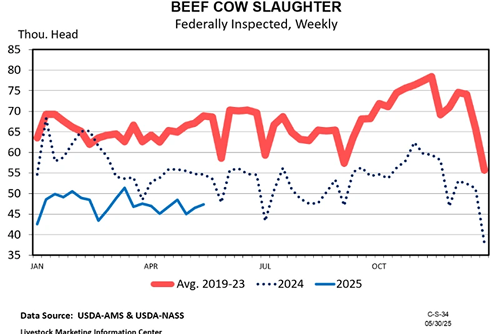 La faena de vacas en Estados Unidos cayó más de 17% hasta mediados de mayo y, de mantenerse esa tendencia, 2025 cerrará con el nivel más bajo desde 2015, escribió el analista Kenny Burdine en el portal Drovers.