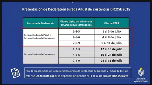 El Ministerio de Ganadería, Agricultura y Pesca (MGAP), a través del Sistema Nacional de Información Ganadera (SNIG), recuerda que la Declaración Jurada Anual de Existencias de Ganado y Frutos del País correspondiente al ejercicio 2024-2025 deberá presentarse durante el mes de julio, respetando el calendario establecido según el último dígito del número de DICOSE. El trámite podrá realizarse en formato papel o electrónico, y se exhorta a todos los productores a cumplir estrictamente con los plazos fijados, a fin de evitar saturaciones del sistema y asegurar la correcta actualización de los datos.