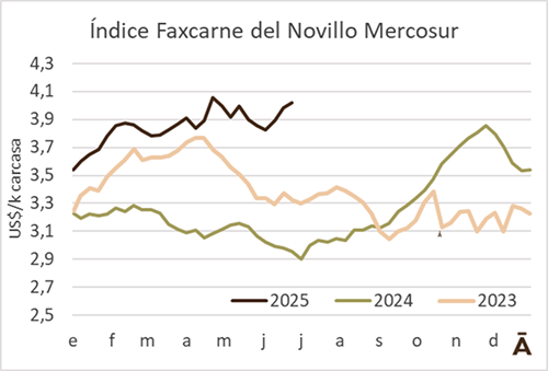 El valor medio del novillo a faena en los países del Mercosur subió por tercera semana consecutiva y volvió a superar los US$ 4 por kilo carcasa, algo que, en lo que va del año, solo se ha dado en tres semanas. El Índice Faxcarne del Novillo Mercosur aumentó 4 cents en la semana a US$ 4,02 el kilo carcasa.