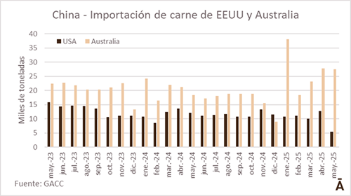 La llegada a China de carne vacuna estadounidense sintió fuertemente el impacto de la guerra arancelaria. De acuerdo con datos del GACC, en mayo llegaron desde Estados Unidos 5.481 toneladas de carne vacuna, con un descenso mensual de 57% y el menor volumen en varios años.