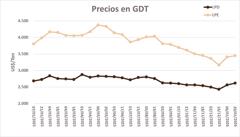 La licitación 396 de la plataforma electrónica Global Dairy Trade (GDT), la segunda del mes de enero mantuvo la tendencia alcista de la venta anterior. El promedio ponderado para todos los lácteos, donde mayormente se comercializan productos de Fonterra, cerró en US$ 3.615 por tonelada, registrando una suba del 1,2% en el promedio ponderado respecto a la venta anterior.