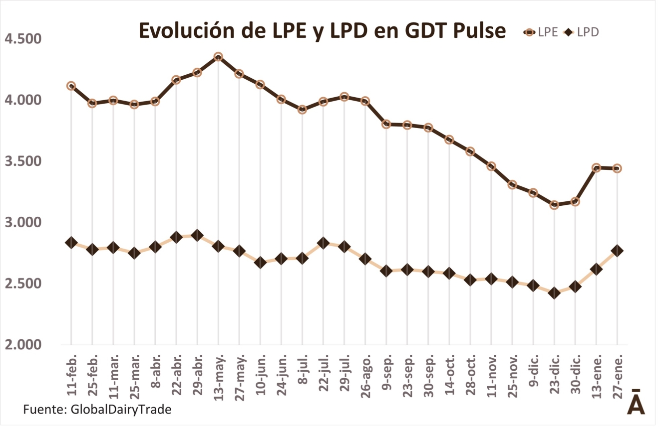 La subasta 99 de Global Dairy Trade (GDT) en su formato Pulse, donde se comercializa únicamente leche en polvo, frenó las subas consecutivas que traía la leche entera (LPE), mientras que la descremada (LPD) siguió subiendo.