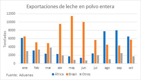 Argelia domina como principalísimo destino dentro del continente africano y es el segundo principal destino global para la leche en polvo entera uruguaya. Los otros dos países del norte de África en los que se ha colocado el producto son Egipto y Libia, este último con un volumen creciente. De las 700 toneladas que se embarcaron a Libia en lo que va del año, 575 toneladas salieron en octubre. Seguramente sea en estos destinos además de otros en los que aún no se ha logrado incursionar, caso de Túnez o Marruecos, a los que se refiere el presidente de Conaprole.