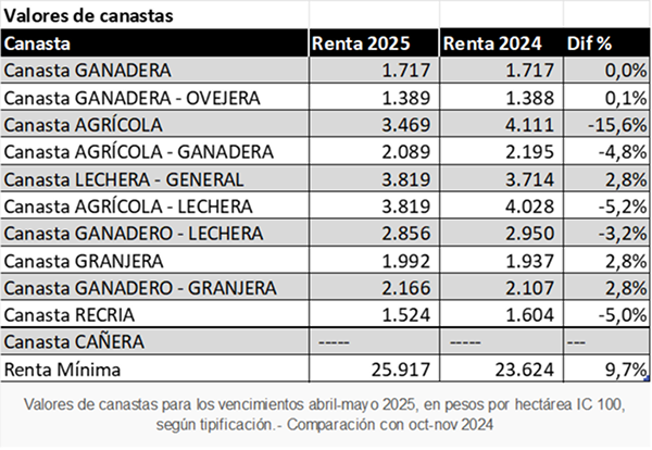 De acuerdo con los valores publicados, el valor de una renta ganadera por hectárea, índice Coneat 100, se posiciona en 1.717 pesos uruguayos, sin cambios respecto a los valores de oct-nov. Por su parte, las rentas agrícolas pasaron a cotizar 3.469 pesos uruguayos, disminuyendo un 15,6%, mientras que las rentas lecheras se ubicaron en 3.819 pesos uruguayos, subiendo un 2,8% al igual que las granjeras, las que se ubican en 1.992 pesos por hectárea.