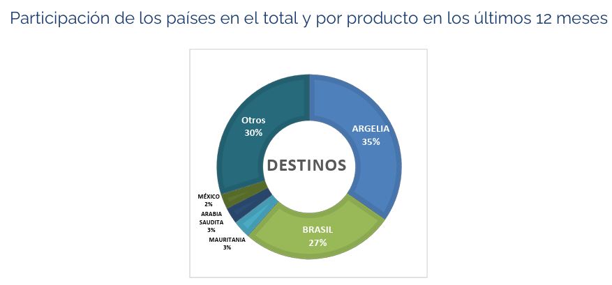 En términos de mercados, Argelia se mantuvo como el principal destino de los lácteos uruguayos (35%) en los últimos 12 meses, seguido por Brasil (27%), con Mauritania (3%) y Arabia Saudita (3%) también entre los principales compradores.