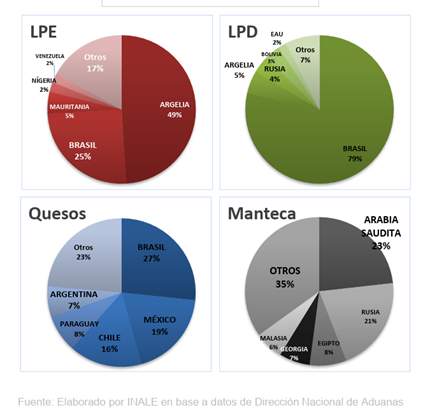 A nivel de producto, se registraron incrementos en las exportaciones de manteca (6% a US$ 75 millones) y leche en polvo entera (19% a US$ 671 millones). Precisamente, el predominio de este producto en la canasta exportadora se acentuó con una participación del 70% en 2025.