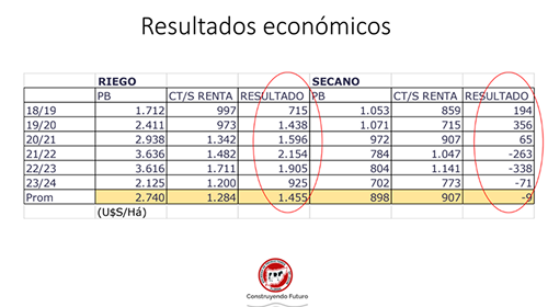 Barreira recordó que la inversión en riego sin Comap es de US$/ha 4.500 (represa y equipo instalado). Esa inversión se puede amortizar en un plazo de 10 años a razón de US$/ha 960 anual, por lo que su inversión está más que justificada dado su retorno económico.