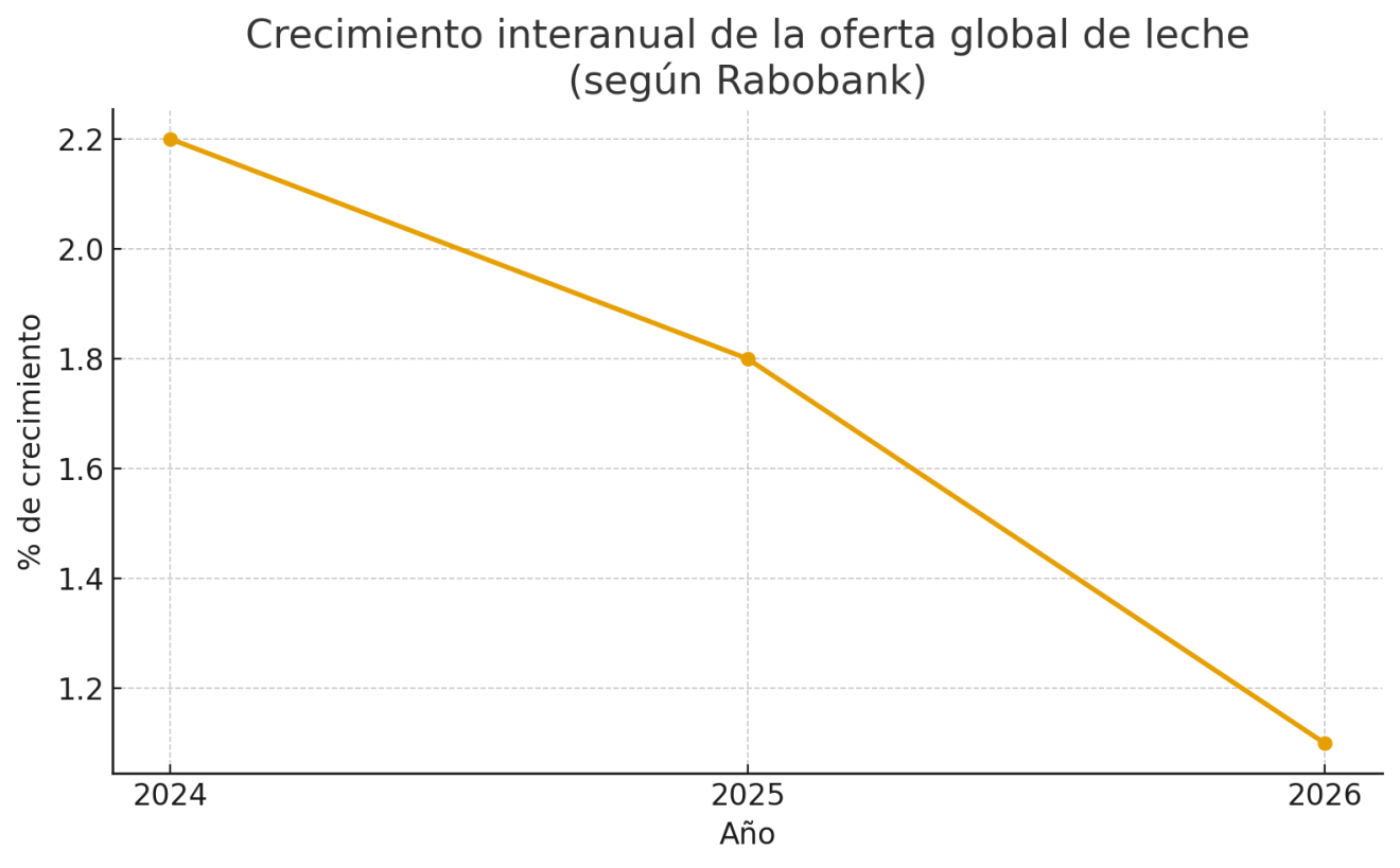 Rabobank prevé moderación en el crecimiento de la producción de leche el próximo año, pero advierte que los precios seguirán presionados por la debilidad de la demanda. El crecimiento de la producción de leche en las principales regiones exportadoras a nivel mundial ha sido más fuerte de lo esperado durante 2025.