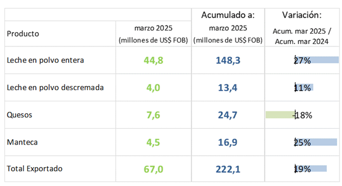 La facturación por la exportación de productos lácteos totalizó US$ 222 millones en el trimestre enero-marzo y creció 19% en la comparación interanual, según los datos en base a Aduanas que divulgó el Inale.