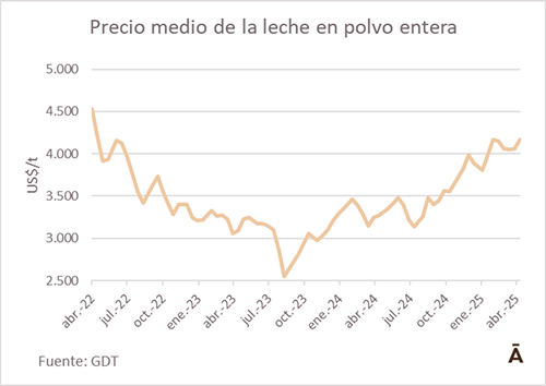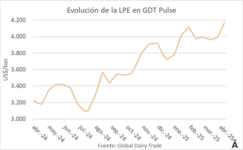 La subasta 77 de Global Dairy Trade (GDT) Pulse de Fonterra, la segunda del mes de abril de 2025 en este sistema, volvió a registrar subas en las dos leches en polvo. Según los datos de GDT, las ventas de la leche en polvo entera (LPE) registraron un aumento del 4,5% y regresó a valores de febrero, mientras que la leche en polvo descremada (LPD) subió 2,9%.