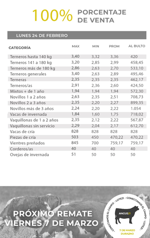 Las terneras, por su lado, se colocaron a US$ 2,35 por kg en promedio (US$ 462 al bulto). En tanto, los novillos de 1 a 2 años hicieron US$ 2,51 por kg en pie, los de 2 a 3 años US$ 2,27, y las vacas de invernada US$ 1,75. La próxima actividad de Lote21 será el próximo viernes 7 de marzo en Durazno.