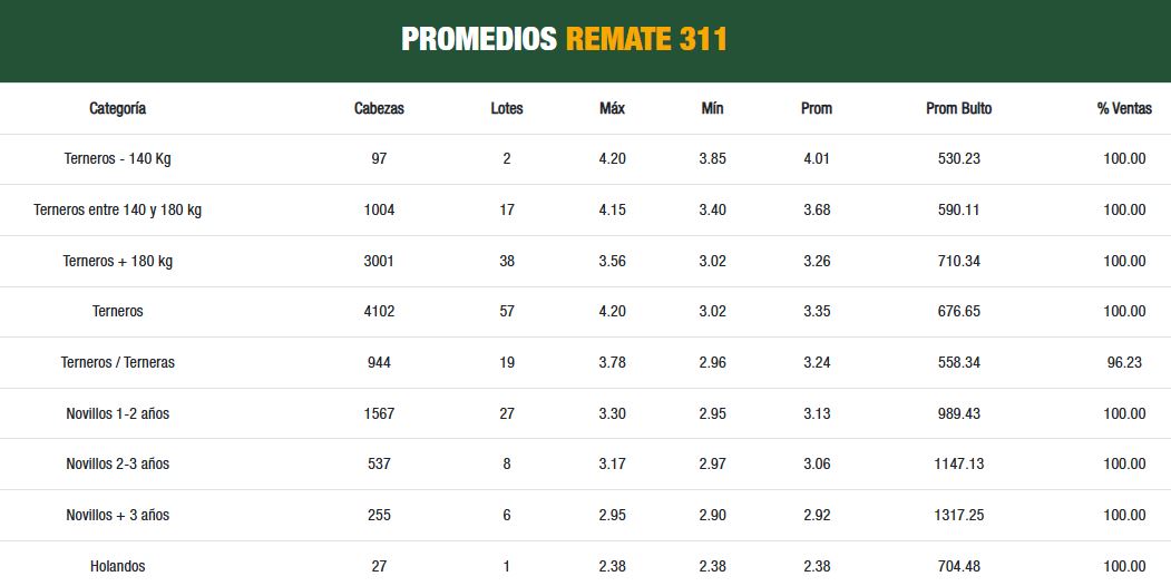 El consorcio Plaza Rural tuvo este jueves su primer día de actividad del remate 311 con una colocación del 100% para la escalera de terneros. El promedio general para toda la categoría fue de US$ 3,35 por kg (US$ 677 al bulto), versus los US$ 3,24 del remate anterior (US$ 712 al bulto).