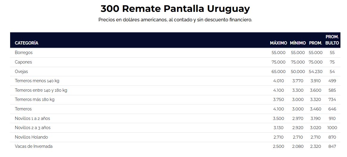 En su remate 300, el consorcio Pantalla Uruguay tuvo este jueves su primer día de actividad con una fluida colocación. Los terneros hicieron un promedio general de US$ 3,46 por kg en pie (US$ 646 al bulto), con un máximo de US$ US$ 4,10 para un lote de terneros livianos de menos de 180 kg. Respecto al remate anterior de agosto (US$ 3,26), los terneros se valorizaron 5,5%.