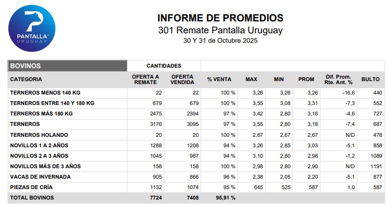 El consorcio Pantalla Uruguay tuvo este jueves 30 de octubre su primer día de actividad del remate 301. Tal como se manejaba en lo previo, se dio una corrección a la baja en las categorías de reposición, tras al pico de valores alcanzados en el remate anterior de fines de setiembre.